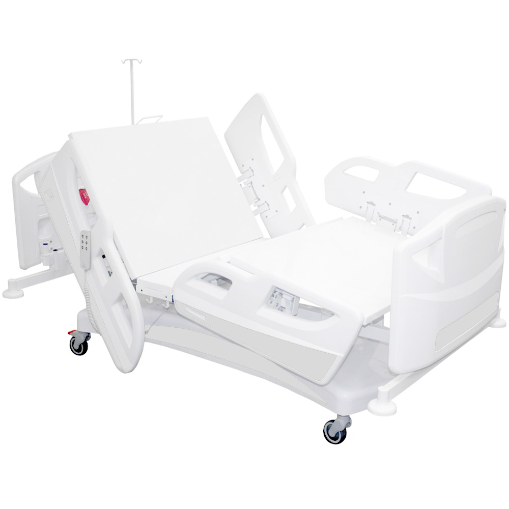 Grades laterais: em plástico PEAD material de alta durabilidade, fácil limpeza e esterilização. Seu acionamento é retrátil com amortecedor e trava de segurança.